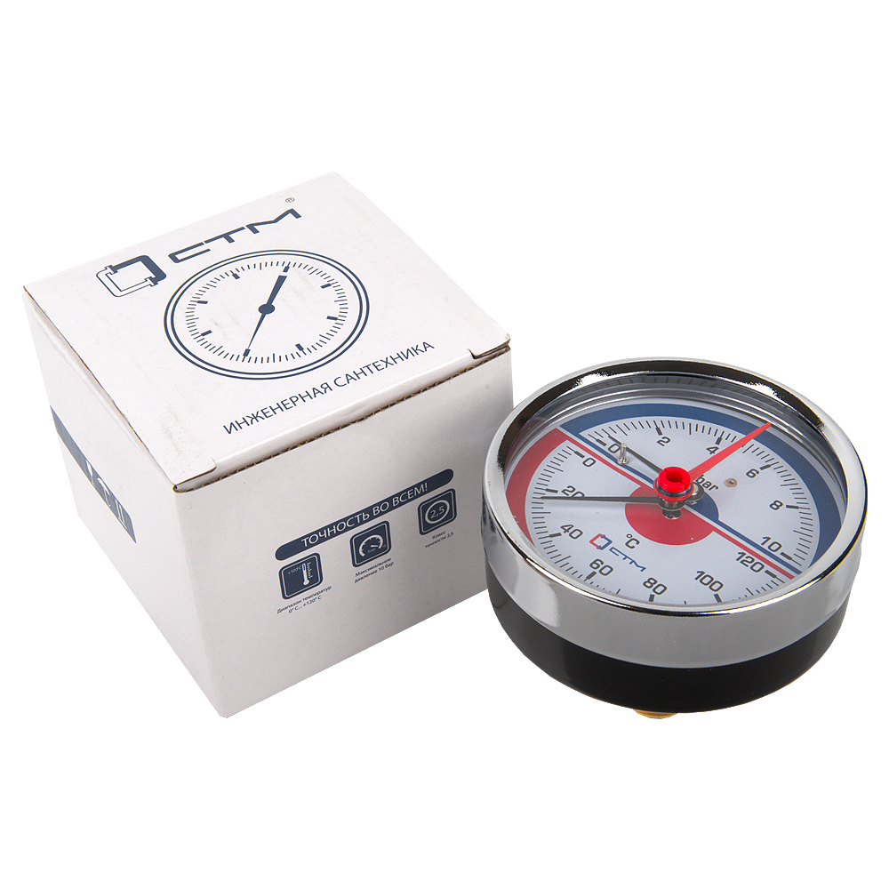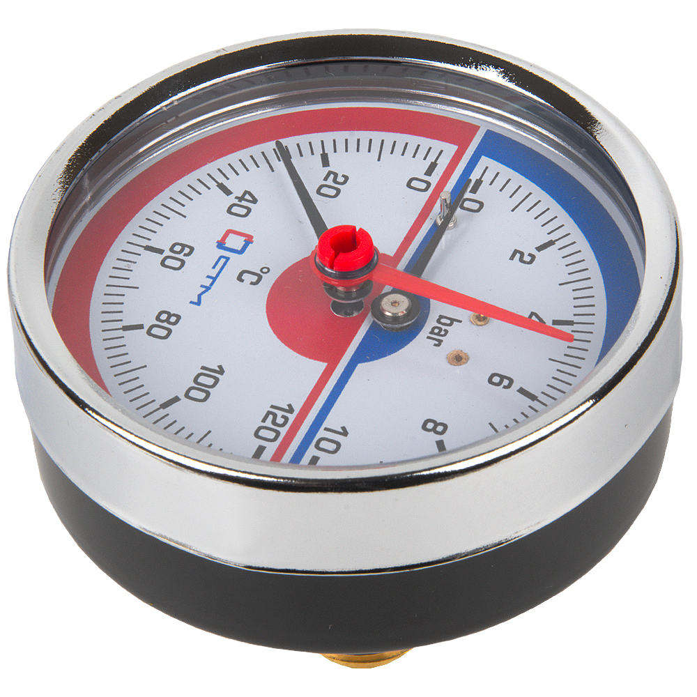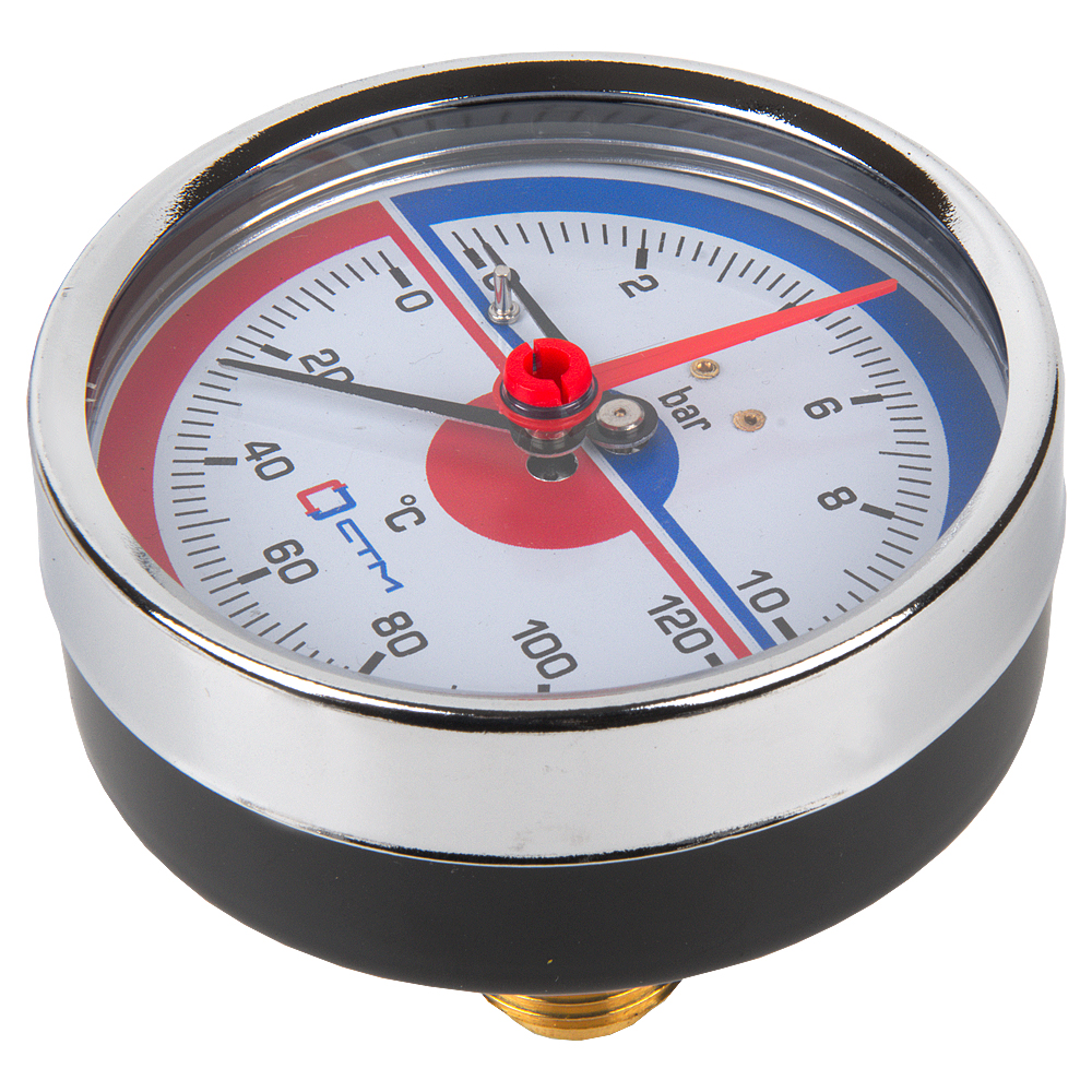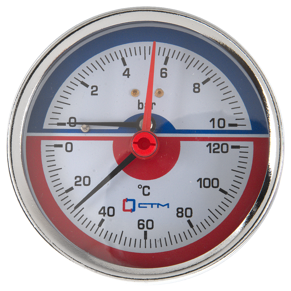 Термо-манометр СТМ аксиального подключения 1/4", измерение до 10 бар, до +120° С предназначен для индикации температуры и давления на бытовых системах отопления и водоснабжения.